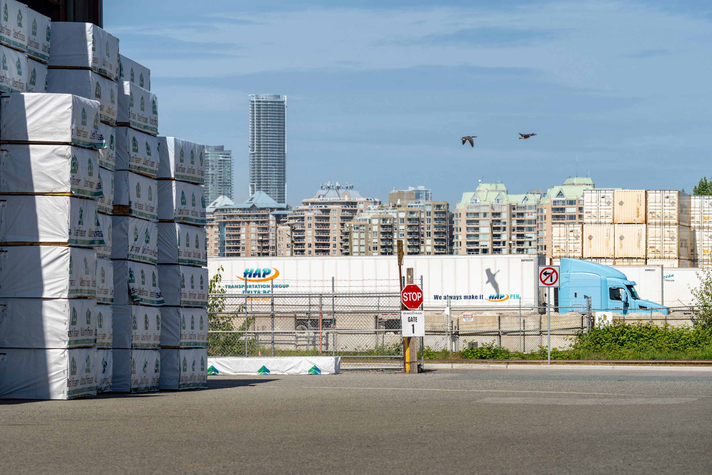 Just off Highway 91, the Richmond terminal is within 25 minutes of all four major Lower Mainland ports. The yard layout keeps trucks and forklifts separated for maximum safety and speed.